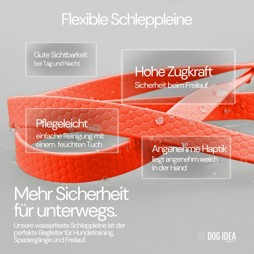 Unsere wetterfeste Schleppleine in leuchtendem Orange ist der perfekte Begleiter für Hundetraining, Spaziergänge und Freilauf. Dank des weichen und flexiblen Materials schneidet die Leine nicht in die Hand ein und sorgt für maximalen Komfort.
